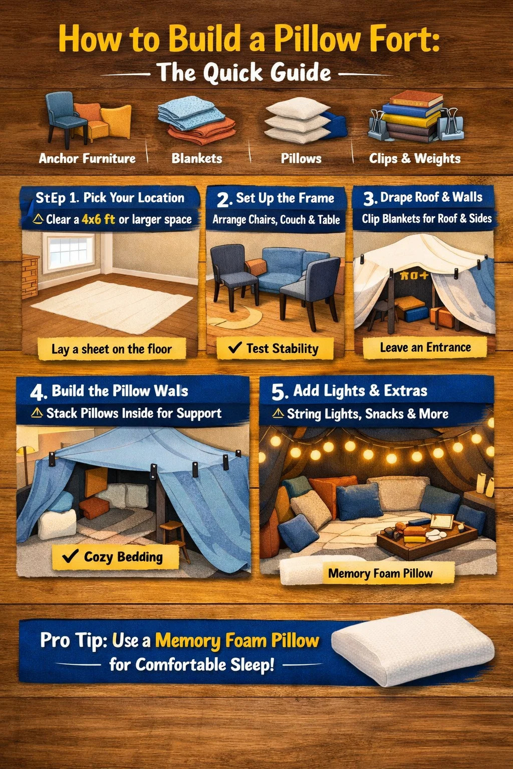 Việc xây dựng một pháo đài gối bao gồm bốn bước cốt lõi: chọn kết cấu nền chắc chắn (như một chiếc ghế dài), treo chăn lên trên để tạo thành tường và mái nhà, xếp gối dọc theo các cạnh và bên trong để hỗ trợ và cách nhiệt, sau đó cố định mọi thứ bằng kẹp hoặc vật nặng. Một pháo đài được xây dựng tốt có thể giữ nguyên hình dạng của nó trong nhiều giờ - và với những chiếc gối phù hợp bên trong, nó sẽ trở nên thực sự thoải mái chứ không chỉ là một điều mới lạ thời thơ ấu.