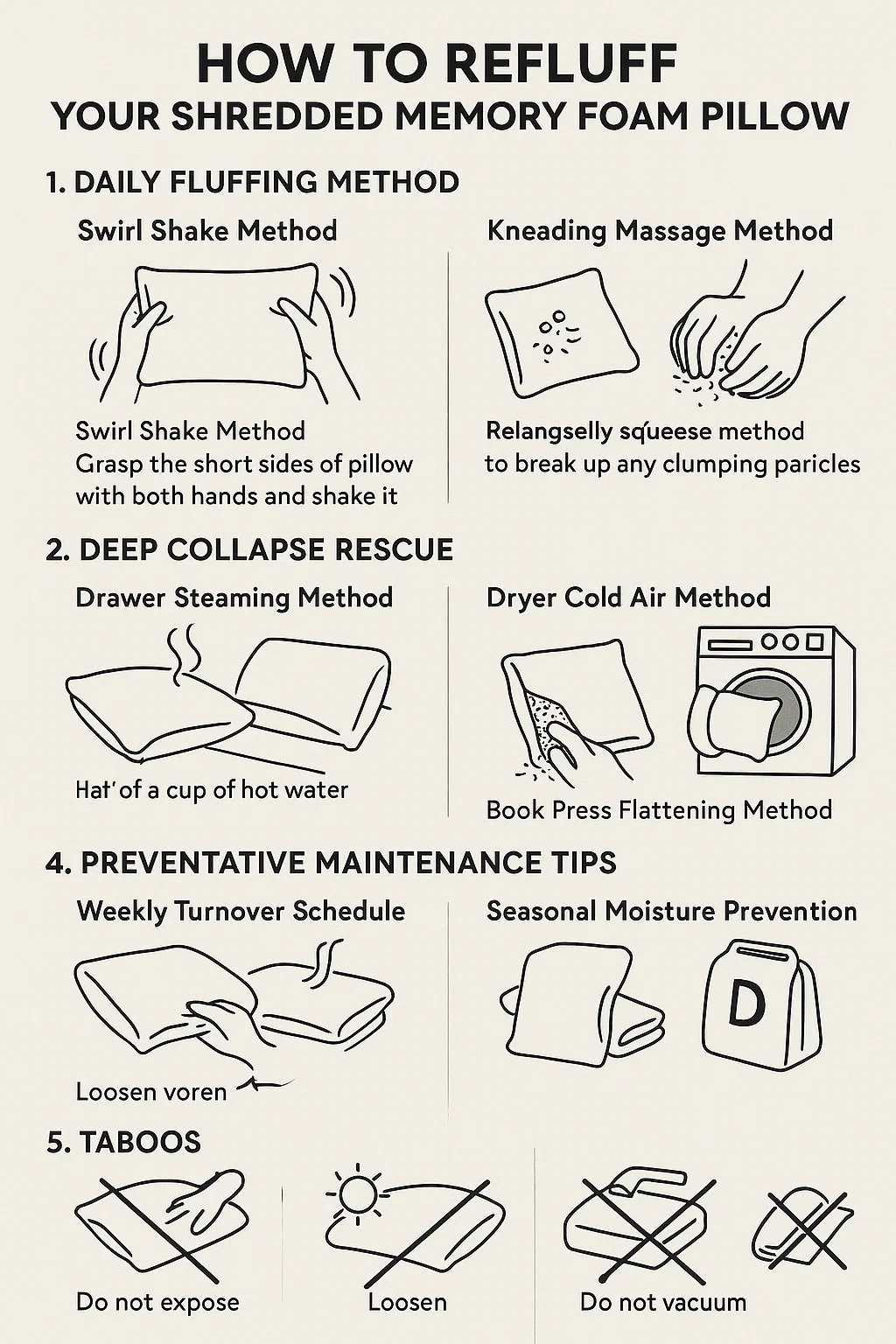 Phương pháp hấp ngăn kéo: Đặt gối phẳng trong ngăn kéo với nửa cốc nước nóng gần đó. Đóng ngăn kéo chặt chẽ và sử dụng hơi ẩm để làm mềm bất kỳ hạt vón cục nào. (Hủy bỏ và lắc sau 20 phút.)